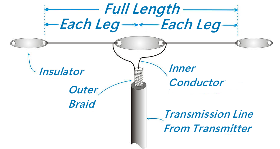 The half-wave dipole is very simple to construct. Use 75 or 50-ohm cable to feed the center of the dipole. This could be 50-ohm types such as RG58, RG8X, RG8, RG213, or 75-ohm type such as RG11, RG59, RG6 or even 75-ohm twin lead. Even zip cord such as what is used for lamp cords will perform aquatically.